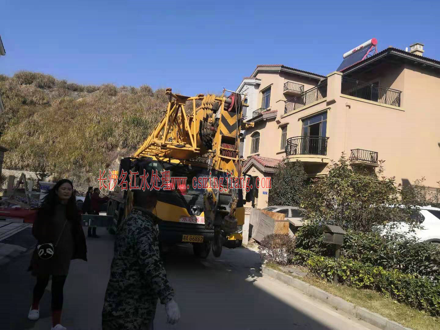 阳光明媚,名江工作人员正在准备游泳池空气能吊装进场,恭喜浏阳刘姐家泳池空气能吊装进场!!